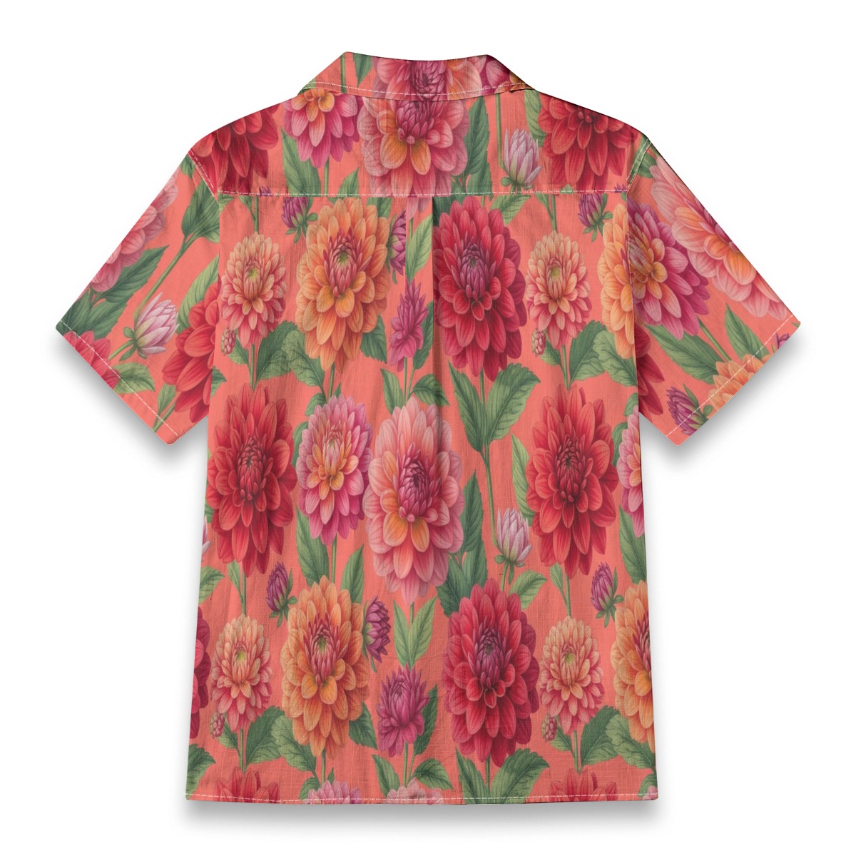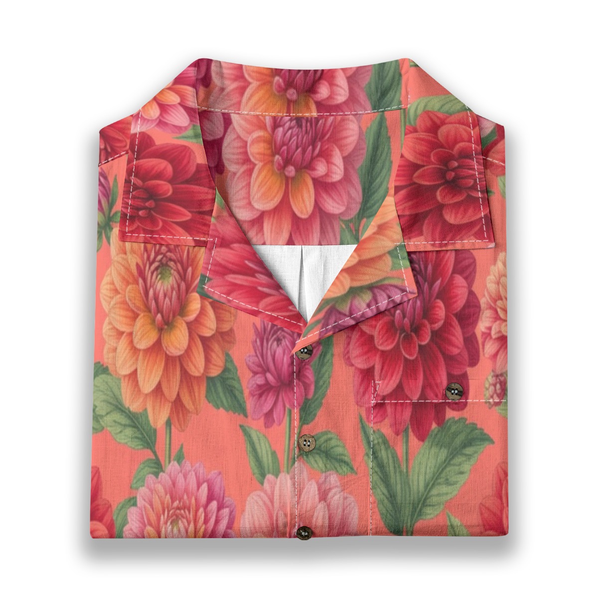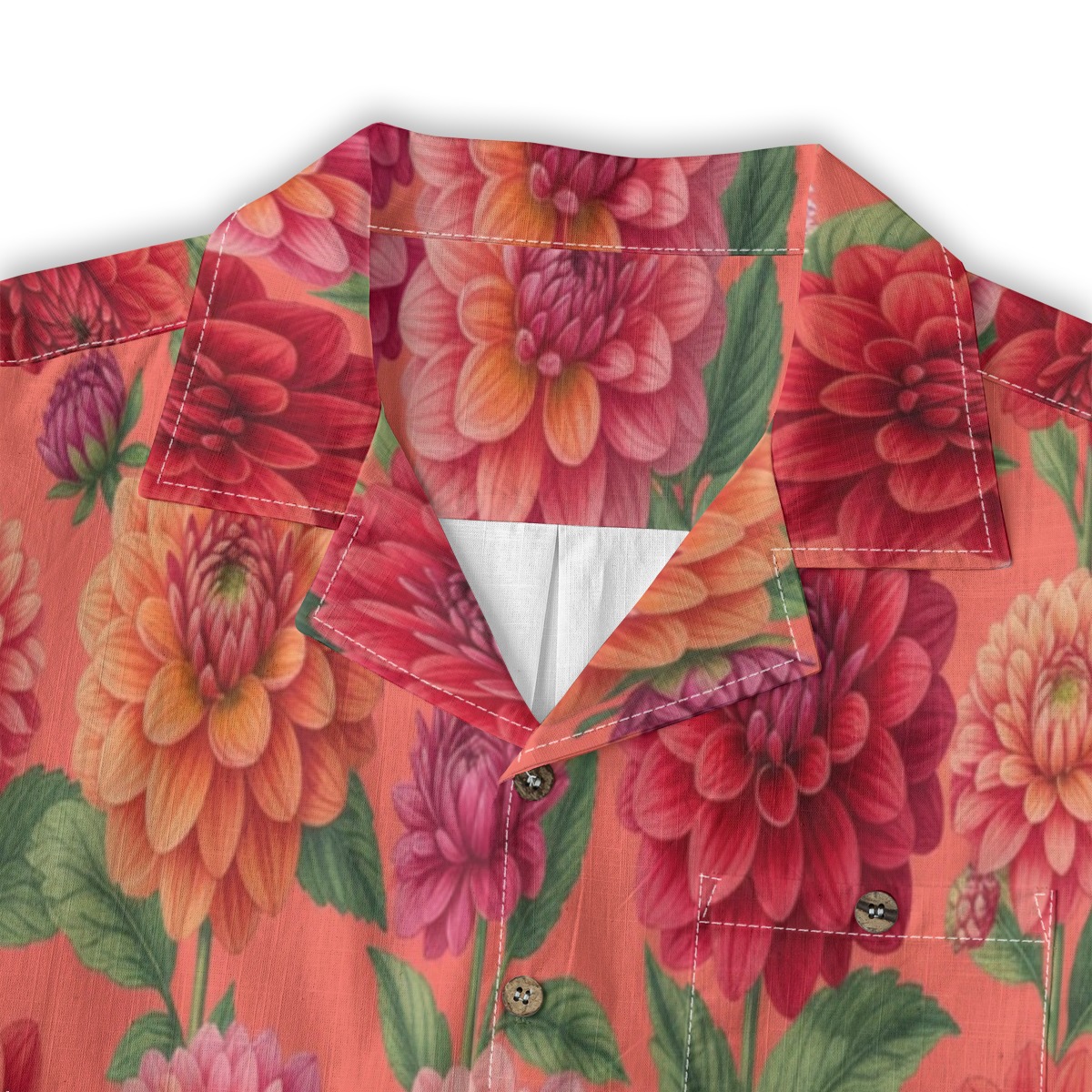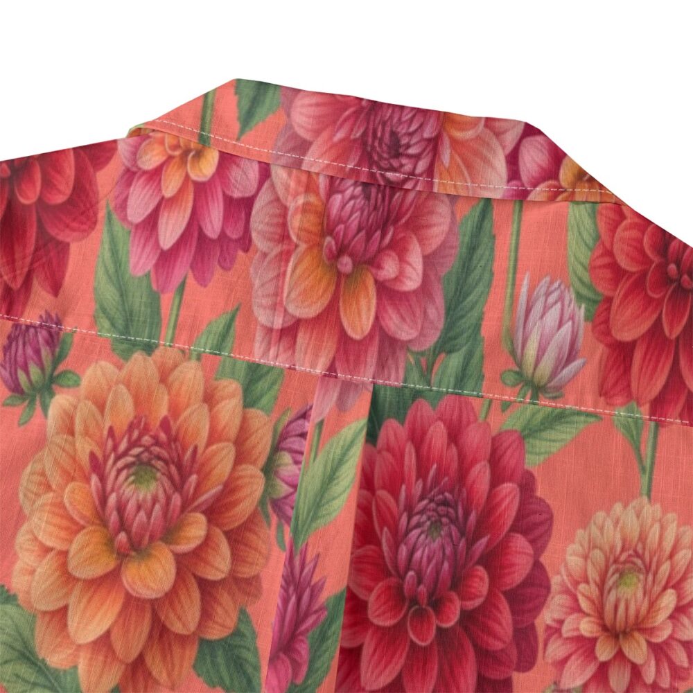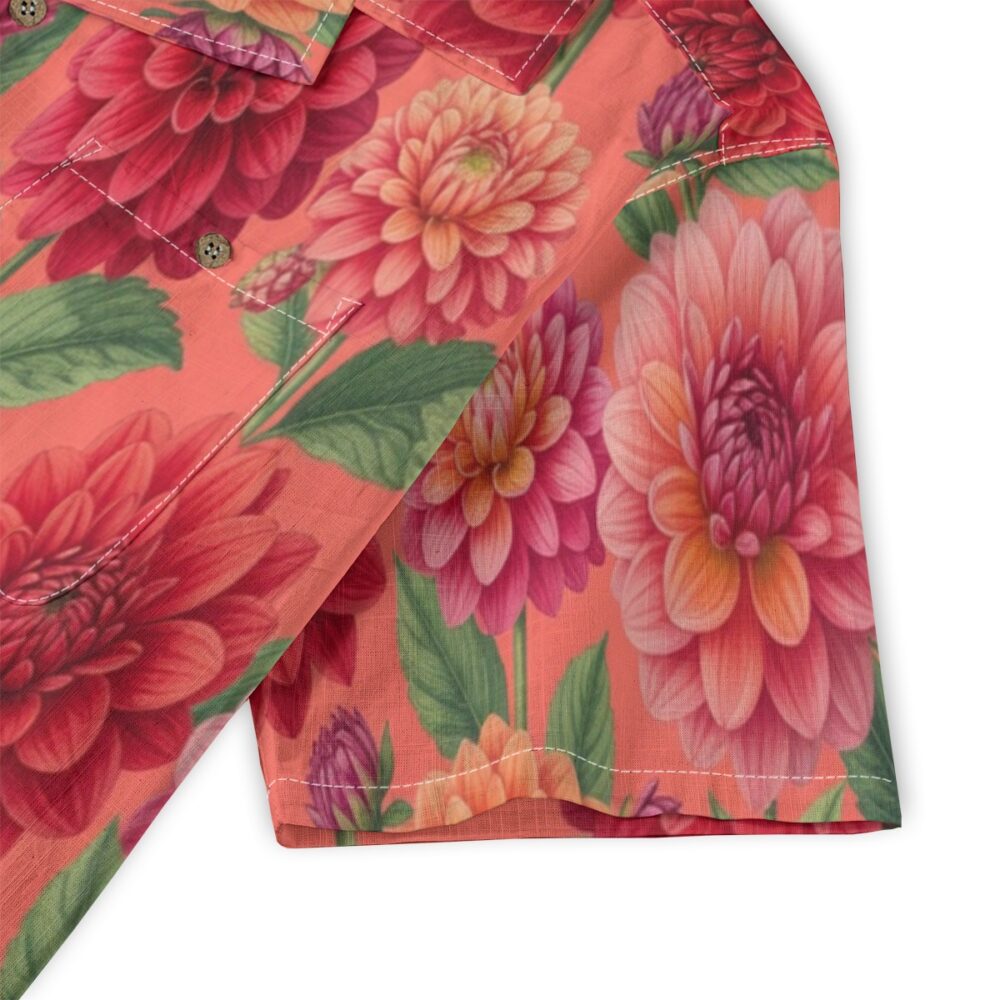 Layered dahlia petals create a rich and textured pattern full of vibrant color. Coral tones blend with reds and pinks, forming a lively tropical display.